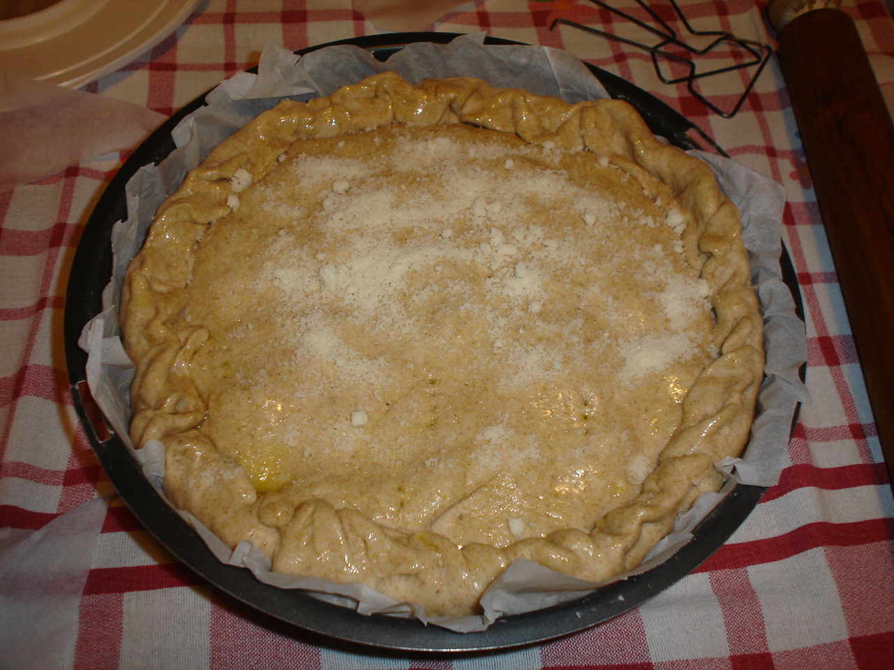 Con la forchetta di nuovo bucherellare il "coperchio" di impasto, pennellare con olio e spolverare con parmigiano (serve per dorare meglio e dare un gusto più deciso).