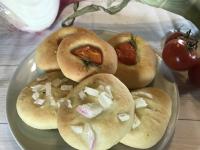 Riprendi le focaccine e schiaccia con i polpastrelli senza forare l'impasto, con un pennello per alimenti, distribuisci l'emulsione di olio ed acqua. Guarnisci come preferisci e cuoci a 180° in forno già caldo, per 15/20 min (attenzione al tempo di cottura ogni forno è a sè. Le focaccine dovranno mantenere un colore chiaro e non biscottato)