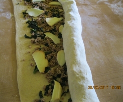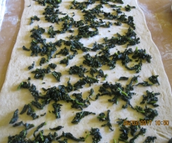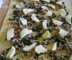 "coperchio chiuso" inserire l'olio e il cavolo con un po di sale e cuocere per 10m a 100' vel 1 spatolare per far scendere il cavolo.Mettere in un contenitore a raffreddare. - Stendere la pasta lievitata in un rettagolo il più fine possibile e coprire con il cavolo.