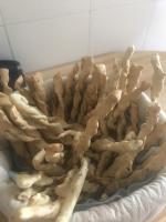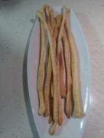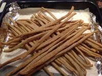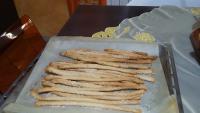 Tagliare delle striscie di circa un cm e arrotolarle un po' per farle cilindriche, senza maneggiarle troppo (volendo, si possono lasciare così e i grissini diventano piatti ). Sistemarli nelle teglie con la carta forno e infornare a 190°-200° ventilato per circa 13-15 minuti alternando le teglie (con questa dose ne vengono tre). Terminare la cottura per qualche minuto ancora aprendo il portello del forno a fessura per lasciare uscire l'umidità.