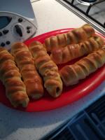 Aggiungere la farina e il sale. 15 sec. vel 4 (giusto il tempo di controllare se la consistenza è giusta) e 2 min. vel spiga. Togliere l'impasto, stenderlo con il matterello formando una sfoglia di circa 1/2 centimetro di spessore. Tagliarla in 12 strisce larghe circa 3 cm. Avvolgere uno ad uno i wurstel sulle strisce di pasta (a spirale) e metterli su una teglia foderata di carta forno. Pennellarli con 1 rosso d'uovo misto a un pò di latte e lasciarli lievitare per circa 1 ora. Mettere in forno caldo a 180° per circa 20 minuti.