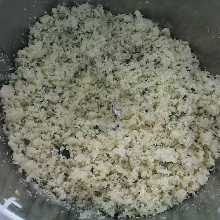 "coperchio chiuso" mettere la cipolla mondata e tagliata in quarti, tritare 3 sec., vel 5, riunire sul fondo e tritare altri 2 secondi. Prendere la zucchina a piccole manciate, strizzarla e rimetterla nel boccale con la cipolla; aggiungere anche il parmigiano, regolare di sale e pepe e mescolare il tutto 10 sec.,