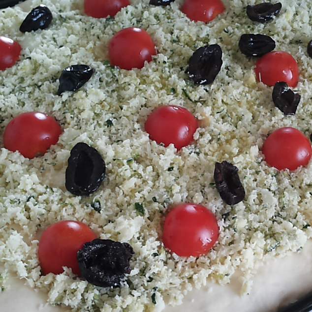 Prendere l'impasto ormai lievitato, distribuirvi sopra il composto di zucchine, i pomodorini, le olive e un filo d'olio; cuocere in forno caldo a 220° per 20 minuti.
