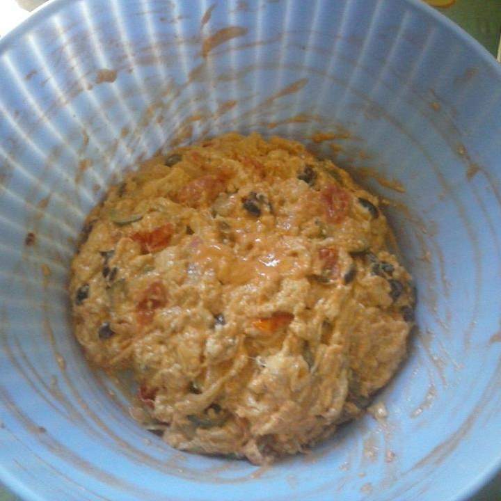 Riprendere l’impasto versarci sopra il soffritto ormai freddo e cominciare ad impastare. All’inizio farete fatica perché  l’impasto non si assemblerà al soffritto ma dopo un po’di manovre otterrete una pasta morbidissima e appiccicosa ma ben amalgamata agli altri ingredienti. Far riposare la pasta per 15-20 minuti nella ciotola. Dopo prendere un piattino e metterci dentro altra semola; prendere delle palline di impasto (aiutatevi con un cucchiaio se avete difficoltà) e passarle delicatamente ad una ad una nella semola come se fosse un’impanatura; scrollare la semola in eccesso tenendo la pallina di pasta fra le due mani. Posizionare ogni pallina sulla teglia ben distanziate e far lievitare 40 minuti in forno spento avendo cura di coprirle con una busta o con la pellicola. Infornare a forno max per 30 minuti.