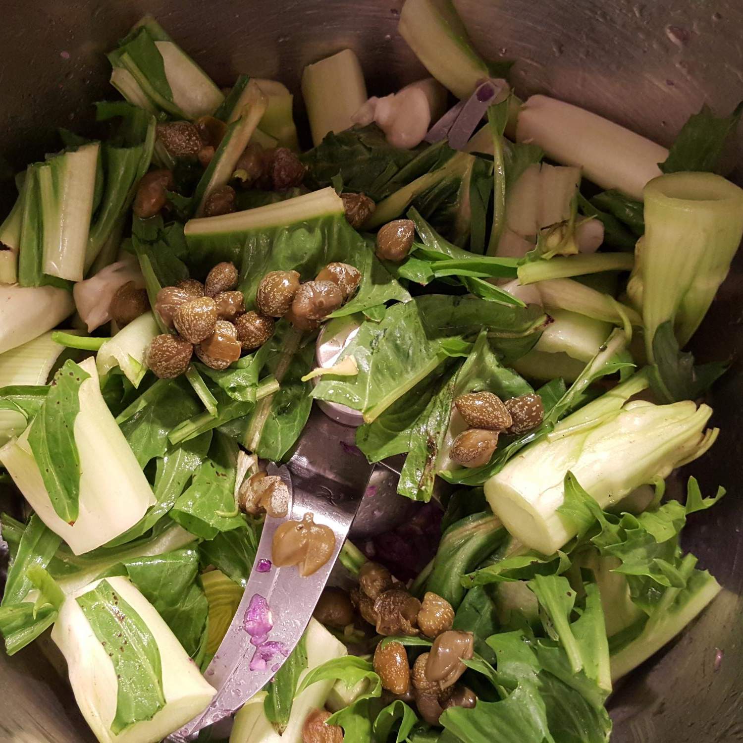 "coperchio chiuso" il porro a rondelle e le puntarelle tagliate grossolanamente e i capperi e sminuzzare per 5 secondi vel.8. - Riunire sul fondo con la spatola e aggiungere l'olio evo, soffriggere 4 minuti 80° vel. 2-3.