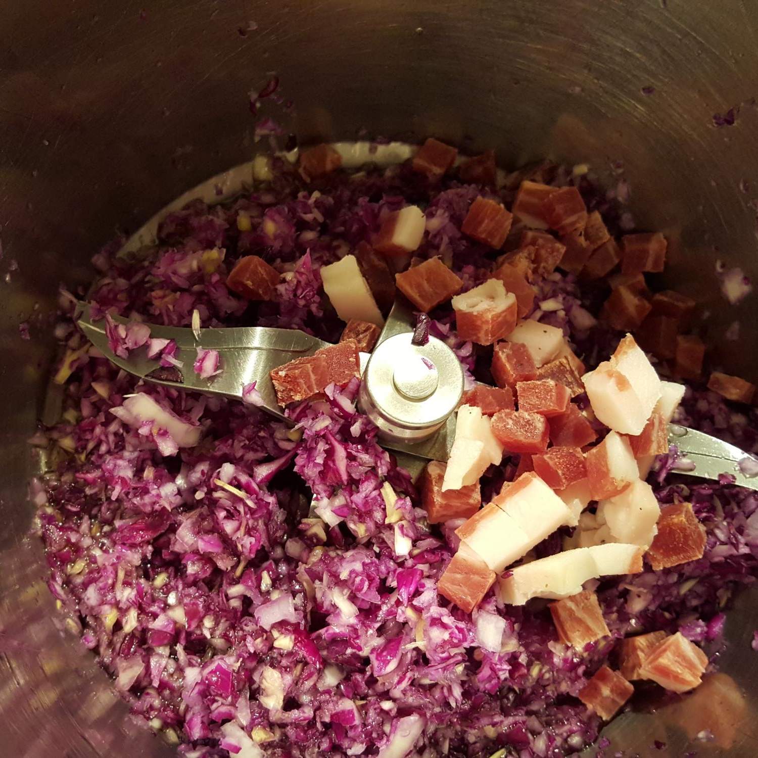 - Aggiungere all'impasto nel boccale il trito di cappuccio rosso e mescolare 30 secondi vel.2-3.
