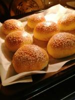 Se usi il lievito di birra in cubetto scioglilo prima nell’acqua e poi aggiungerlo agli altri ingredienti nel boccale, mentre per quello istantaneo (1 bustina) puoi metterlo direttamente nel boccale insieme agli altri ingredienti. Mettere nel boccale tutti gli ingredienti per l’impasto, impastare: 3 min. vel. Spiga, dovrà risultare un impasto liscio e soffice. Prendere l’impasto e impastarlo per qualche minuto con le mani, riporre in una ciotola leggermente unta d’olio, coprire con della pellicola trasparente e lasciar lievitare fino al raddoppio del volume (2 ore). Sgonfiare leggermente l’impasto formando un panetto e dividerlo in 8 pezzi. Formare con ogni pezzi un disco dello spessore di 2,5 cm circa e di un diametro di 8 cm. Mettere i panini su una teglia rivestita di carta forno, coprirli con un canovaccio e lasciar lievitare per un’altra ora. Dovranno essere belli gonfi. Spennellare i panini con l’uovo sbattuto con l’acqua e spolverare poi con i semi di sesamo (io gli aggiunto anche quelli di papavero). Cuocere in forno preriscaldato a 190° per 15 minuti circa o finché non risultino dorati in superficie. Lasciar raffreddare completamente e servire farciti come preferite…