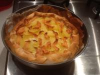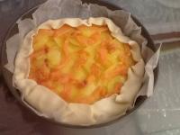 Sulla sfoglia sistemare le patate e spezzettare il salmone distribuendolo uniformemente. Stendere un filo d'olio e aggiungere sale e pepe q.b.