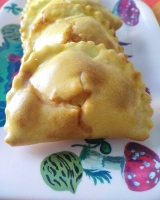 - Mettere sulla striscia di massa il ripieno (circa un cucchiaino colmo), chiudere, tagliare con la rotella e pressare i bordi premendo con i rebbi di una forchetta;