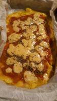 5. Una volta fredda distribuire sulla polenta la polpa di pomodoro, la mozzarella o formaggio, le olive, i capperi e l'origano;