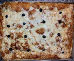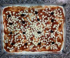 7. Nel mentre in un contenitore condire la passata di pomodo con sale, olio, zucchero e origano. Preriscaldare in forno ventilato con resistenza inferiore al massimo dei gradi. Condire con la passata, il formaggio a cubetti, qualche oliva ed infornare per 15/20 min o fino a completa cottura.
