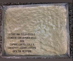 6. Mettendere l'impasto in una teglia 45x35, precendentemente oleata, e stenderlo con la punta delle dita, coprire con pellicola a contatto e lasciare lievitare altri 30 min.