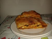 Ho preparato questa pizza rotolo, dei siciliani che avevo come ospiti me l'hanno chiamata "scaccia" facendomi tanti complimenti!! Devo dire che era davvero molto buona, ma complicatissima da fare, guardando su internet ho visto che è presa dal libro: "Il buon profumo del pane" TM21, dunque il procedimento o è spiegato male o è per il modello vecchio. Ho usato solo mezzo panetto di lievito e l'ho fatta lievitare tutta la notte, se si usa la velocità 6 per impastare (come è scritto) il bimby fa uno strano rumore, ho impastato 3 min vel velocità spiga"velocità spiga" L'impasto è venuto molto colloso ed è stato complicato arrotolarla, però il risultato: ottimo (detto dai miei ospiti)  tmrc_emoticons.D anche perchè non è pizza ma pane.