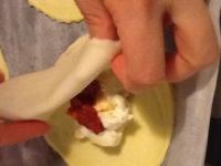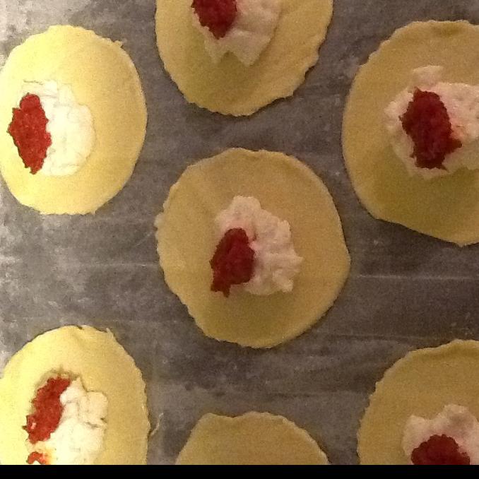 Dopo aver tolto la pasta eccedente, aver sistemato i dischi su una teglia ricoperta di carta forno abbastanza distanziati e ave spennellato i bordi con l'albume, inserire al centro la besciamella-mozzarella e un cucchiaino di pomodoro.