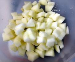 Aggiungere anche vino, zucchero, sale: lasciare marinare mescolando di tanto in tanto anche con le mani, per almeno 1 ora. - Nel frattempo sbucciare la mela, tagliarla a cubetti piccoli (1 cm di lato circa) e metterli in una ciotola col succo di 1 limone.