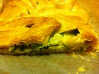 Prepara la pasta vino, stenderla tra due fogli di carta forno abbastanza sottile in due dischi uno più grande l'altro più piccolo. Tagliare le zucchine a rondelle, e l'emmenthal a striscioline, (io uso la mandolina) mettere il disco grande in una tortiera lasciando la carta forno sul fondo, mettere uno staro di zucchine un pizzico di sale pepe, un velo d'olio, il formaggio, continuare gli strati fino ad esaurimeto porre sopra l'altro disco di pasta sigillare i bordi spennellare la superficie con un rosso d'uovo metter in forno caldo 200° per 25/30 minuti.