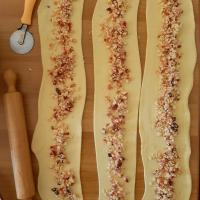 Con le 3 strisce ripiene ottenute formare una treccia oppure arrotolarle formando una grande ciambella.