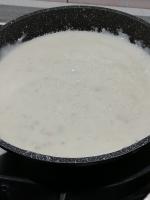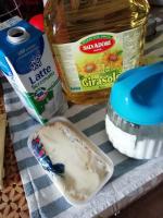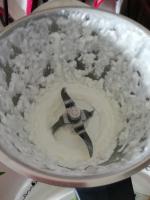 1. Mettiamo il latte e il sale nel coperchio chiuso"coperchio chiuso" e facciamo partire 2 minuti a velocità 8 con il misurino rovesciato cioè con il foro verso il basso e versiamo l'olio sul coperchio in modo che cada piano nel boccale.