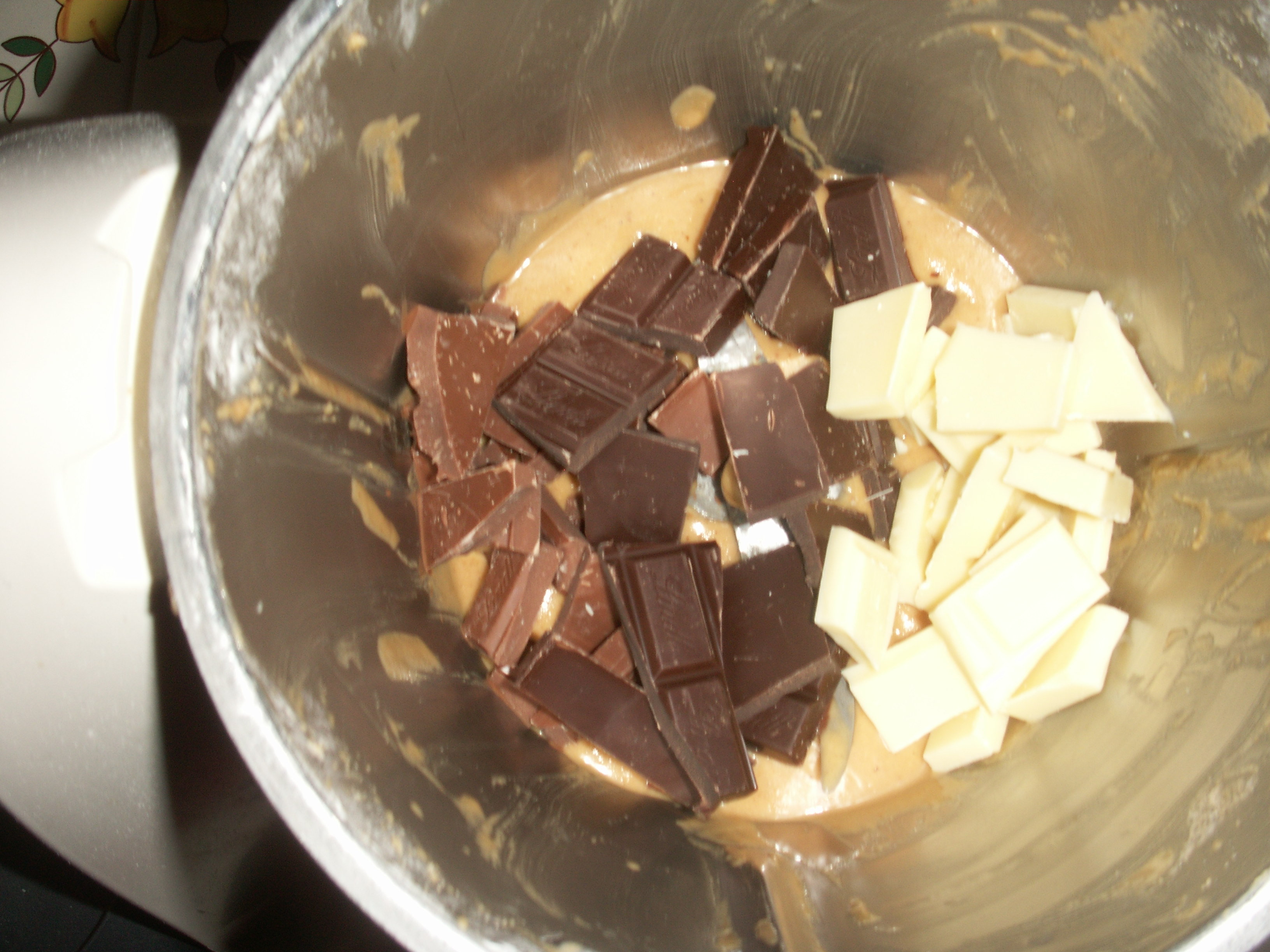 - Aggiungere la cioccolata in pezzi e frullare 20 sec. vel. 8, (vedi foto) raccogliere sul fondo, e 1.30 minuti vel. 5-6;
