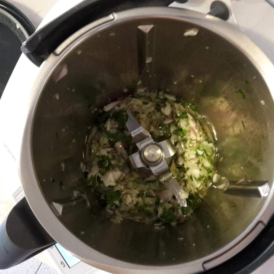 "coperchio chiuso" , tritare per 6 sec a vel 5. Aggiungere l'olio e soffriggere per 3 min 120° vel 1.
