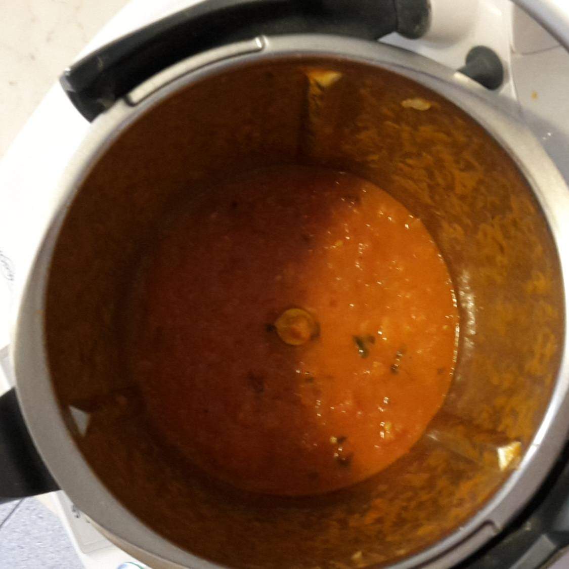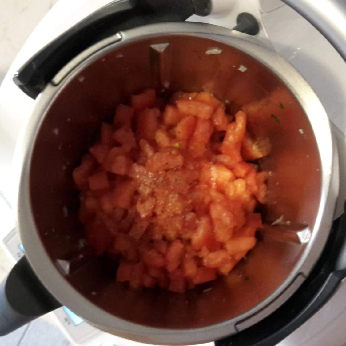 4. Aggiungere i pomodori tagliati a pezzi, regolare di sale e pepe e cuocere per 20 min 120° vel 1 (posizionare il cestello sul boccale per evitare gli schizzi).