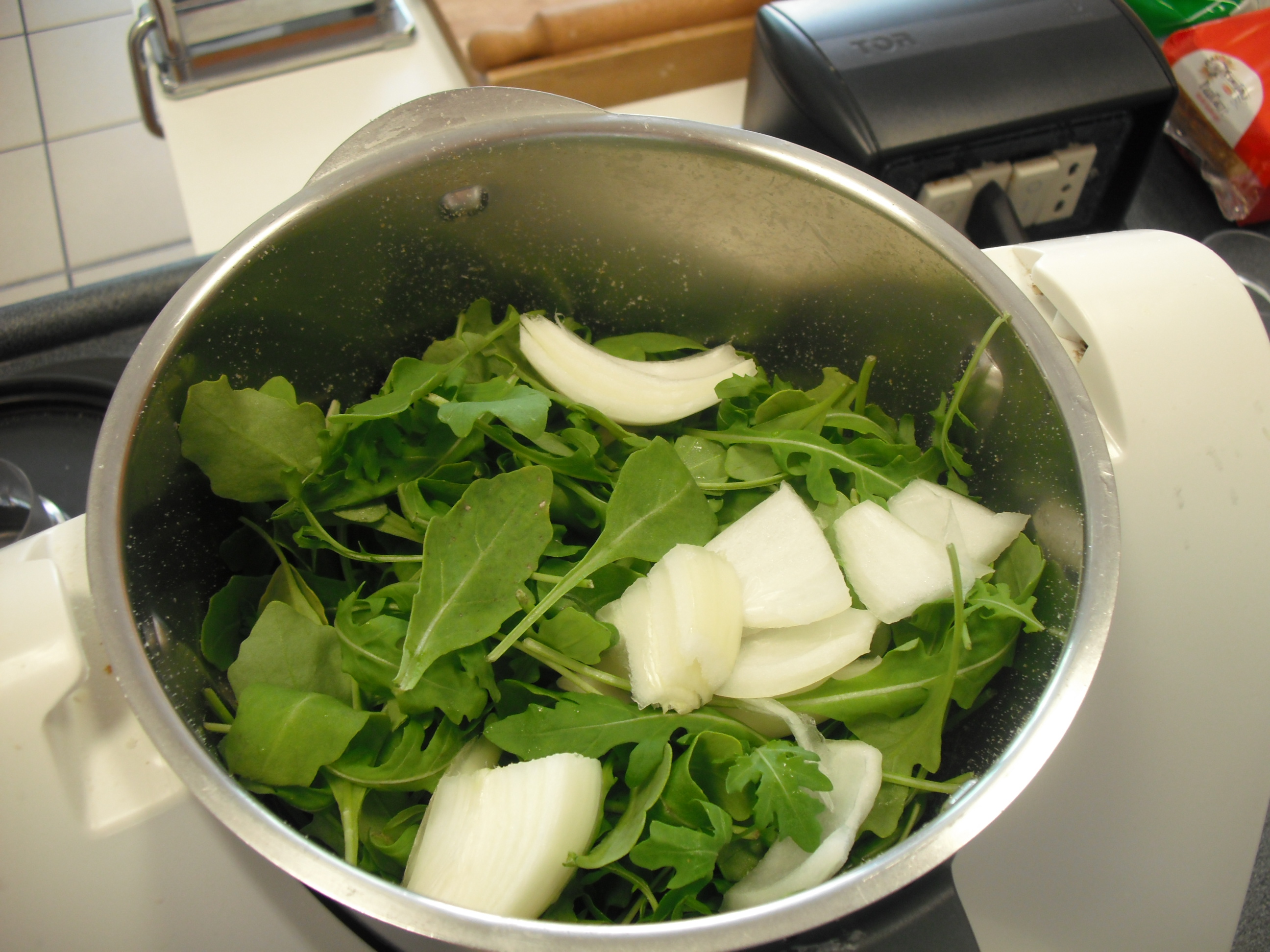 - Mettere nel boccale la rucola, la cipolla e l'aglio, tritare: 10 sec./ vel. 7-8;