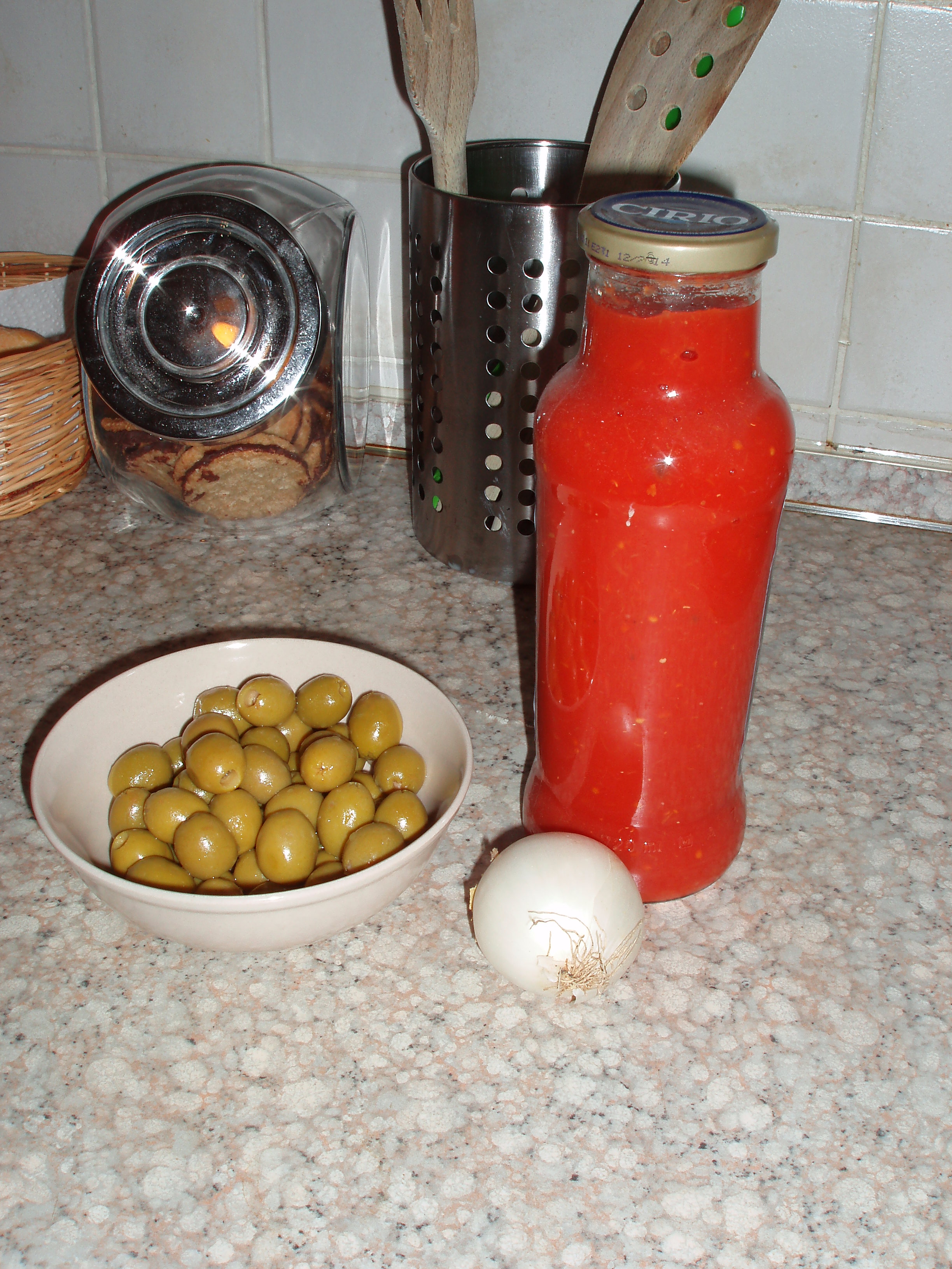 la cipolla tagliata in quarti 5'' vel.5, aggiungere l'olio e cuocere 3 min. vel.2, 100°-Aggiungere le olive e tritare 3'' vel.5, la polpa di pomodoro, il sale, lo zucchero.