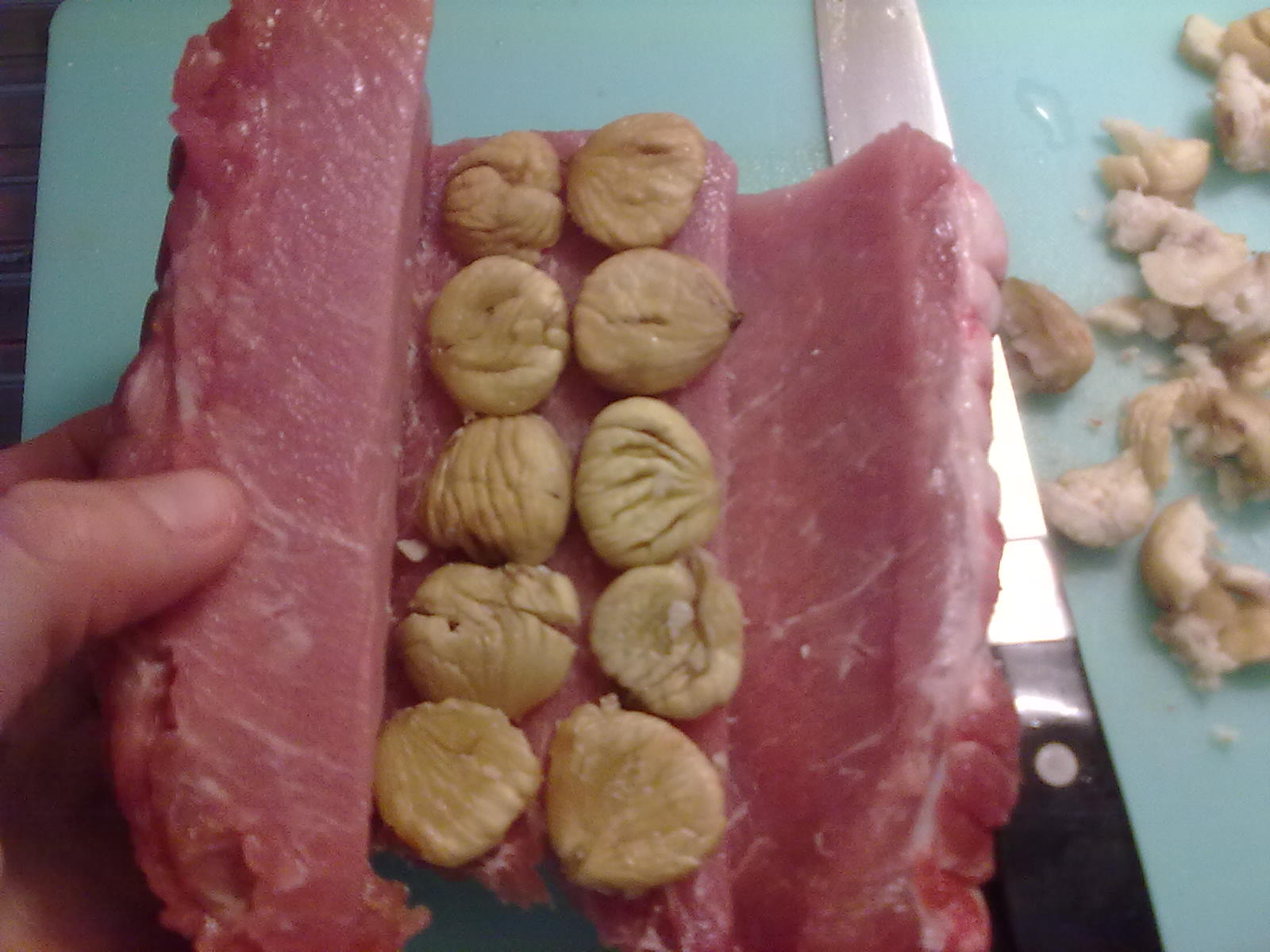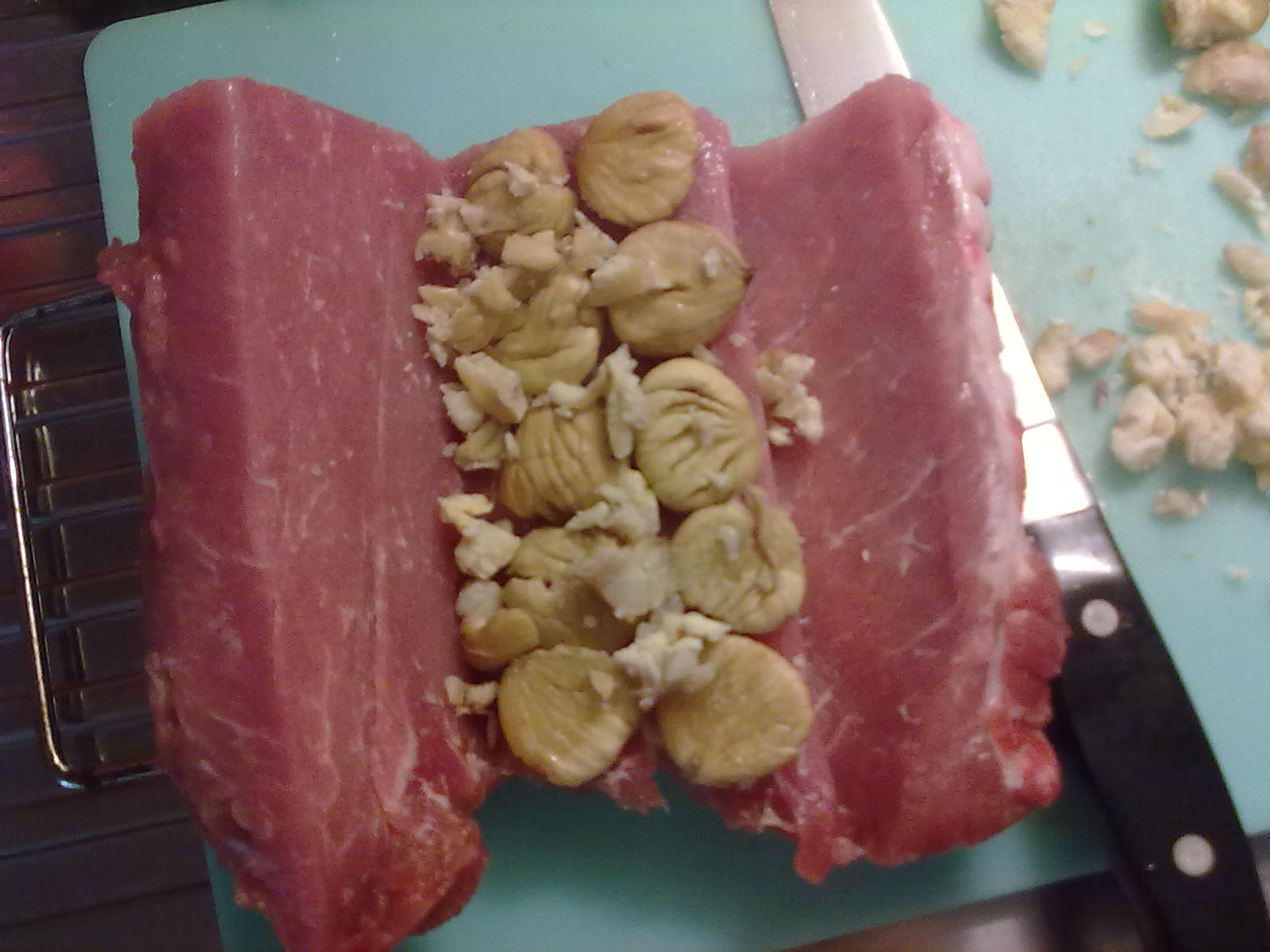 tagliare qualche castagna a metà e farcire l'arista. io sbriciolo anche qualche castagna con le mani per riempire gli spazi vuoti.