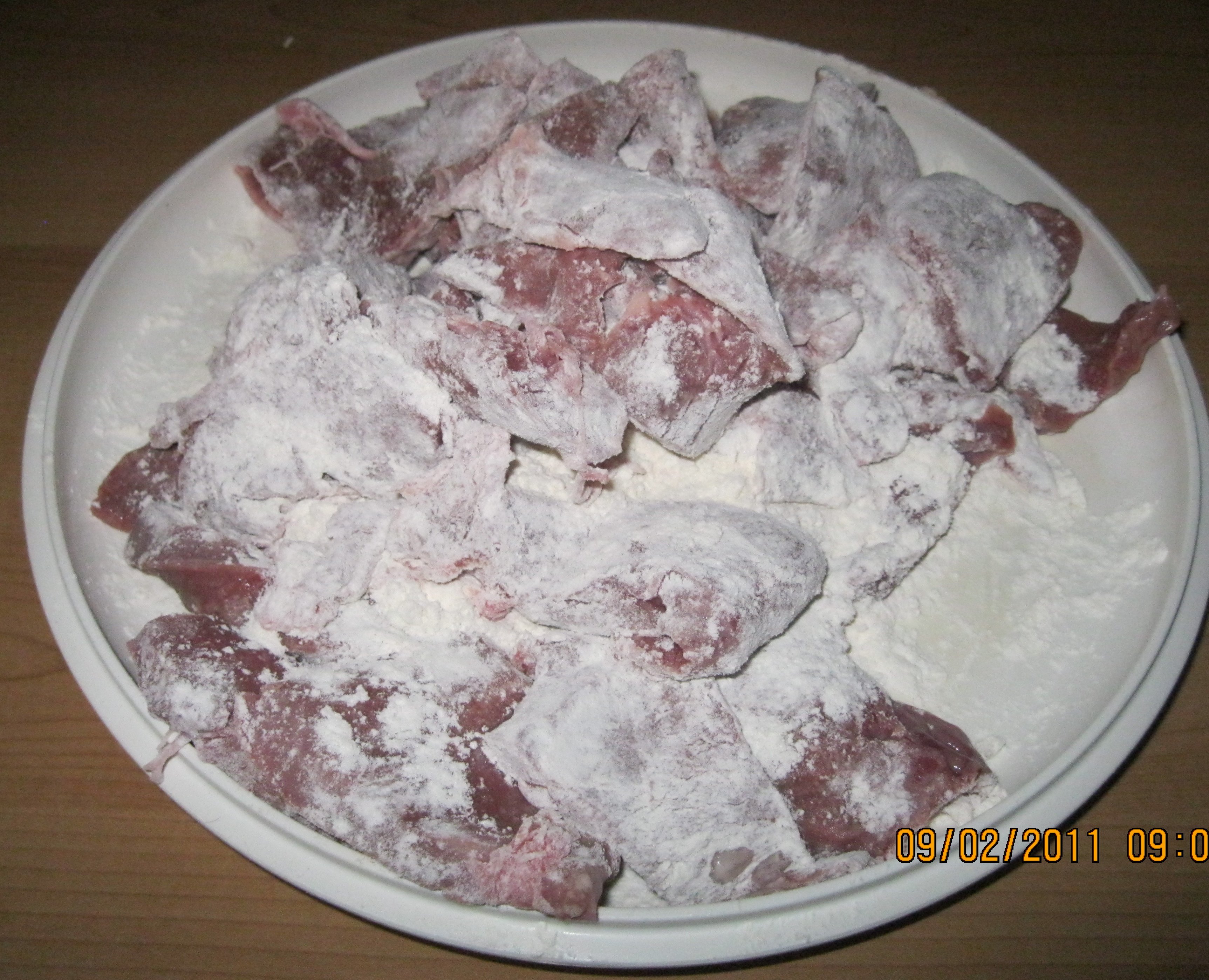 - 700 gdi cuore di vitello tagliato a fette, farna qb, 30 g di olio evo. 1 grossa carota, 1 cipolla, 1 costa di sedano. 100 g di vino bianco secco, 250 g di pomodori a grappolo ,o 200 g di passata di pomodoro, 1 cucchiaio di dado bnimby di carne, 1 mazzetto di prezzemolo tritato.