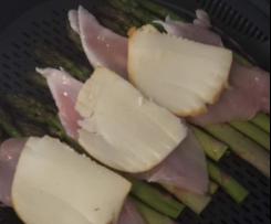 "coperchio chiuso" , posizionare il varoma sul coperchio e adagiare sul vassoio gli asparagi, le fettine di pollo e la scamorza, mettere il coperchio e cuocere per 25 min temp varoma vel 1; - Nel frattempo sbucciare e tagliare a fettine la nespola;