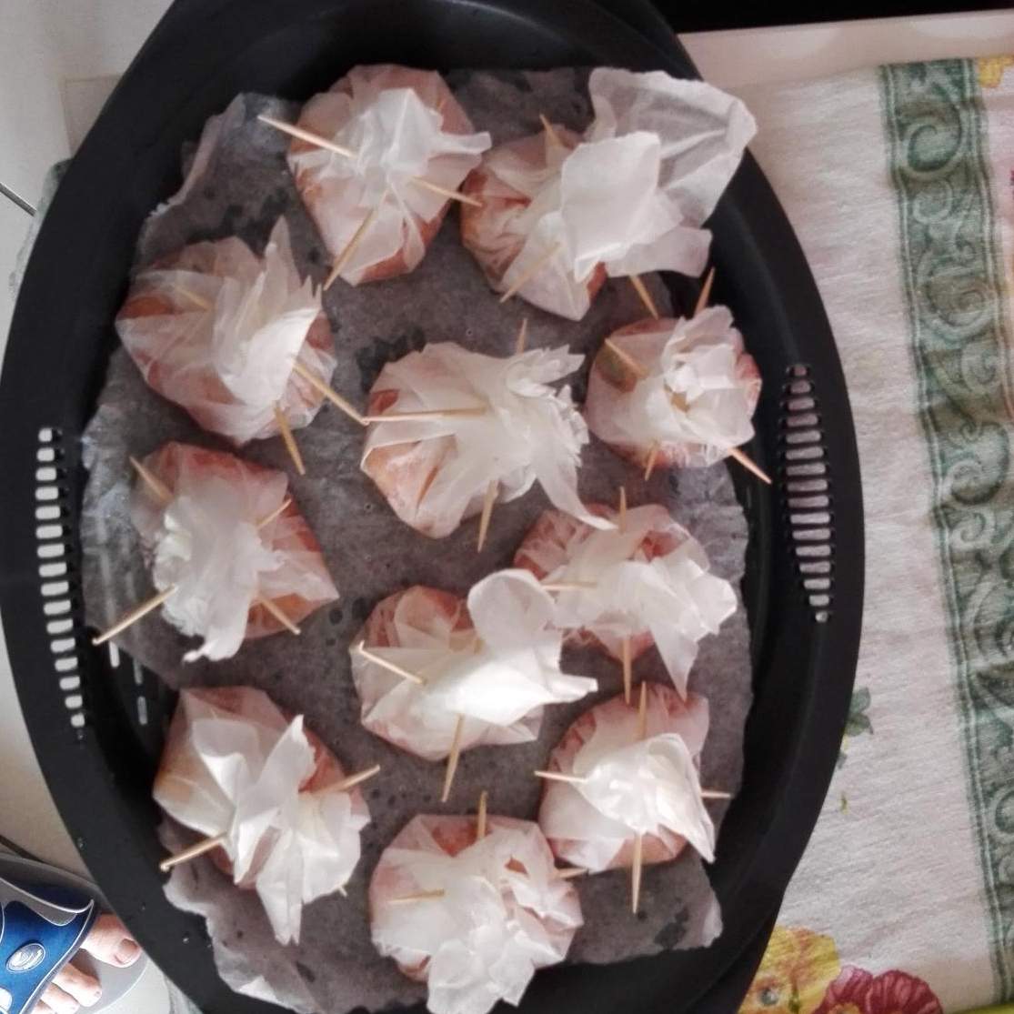 Avvolgere ciascun "bacio" nella carta da forno (o pellicola resistente alle alte temperature) e chiudere con uno stuzzicadenti. Riporre il tutto nel vassoio del Varoma.