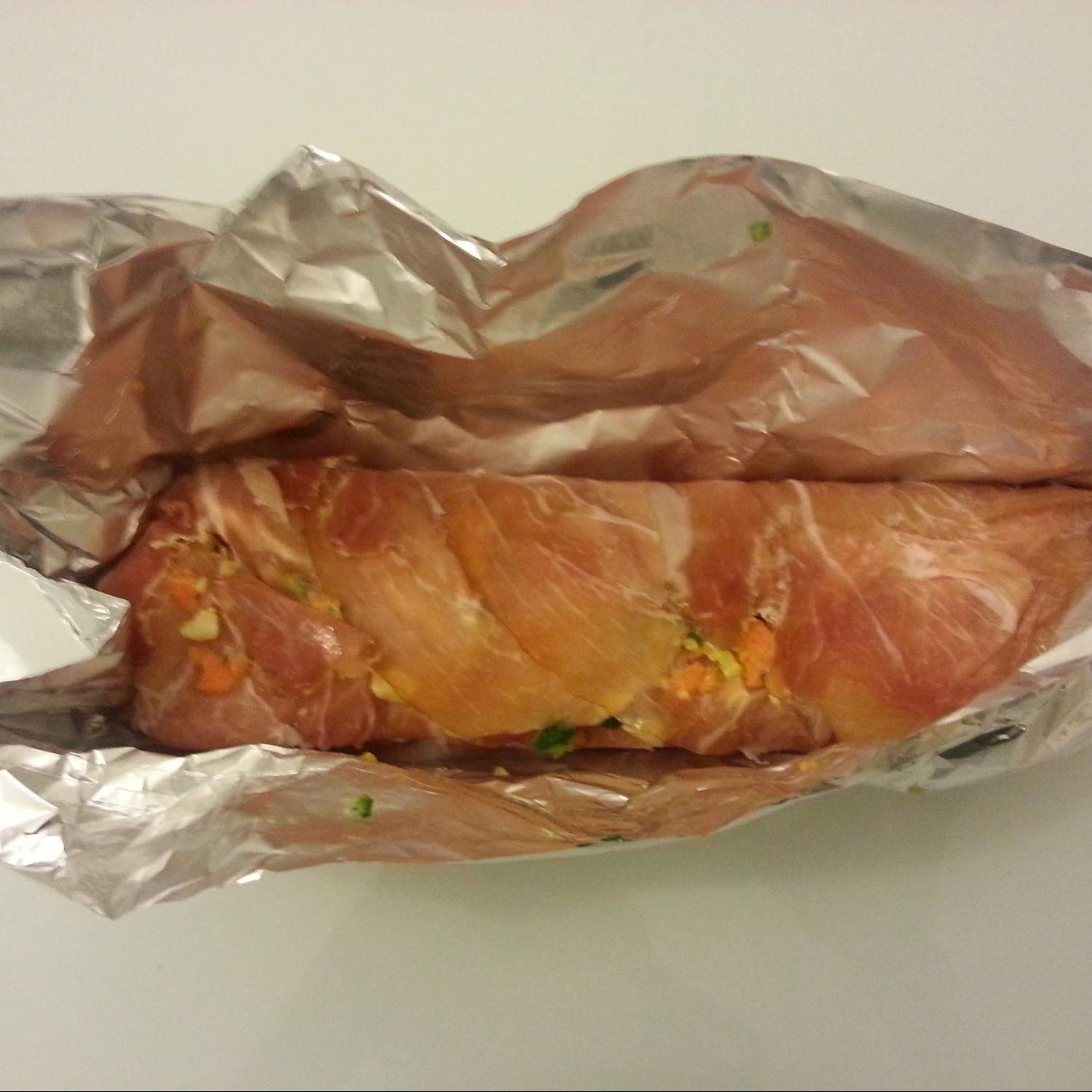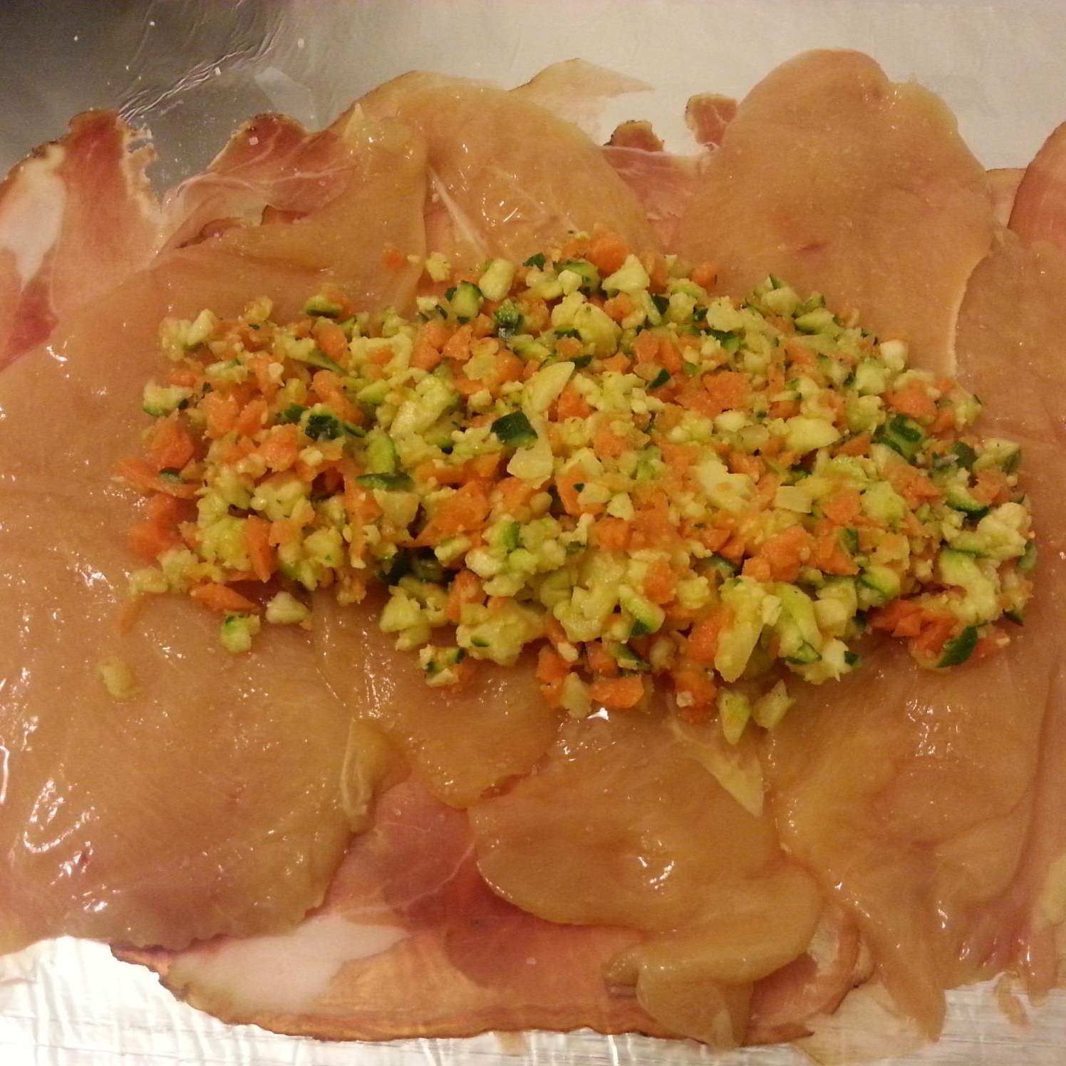 Preparare i due fogli di carta stagnola dove faremo gli involtini, adagiare sopra lo speck coprire bene tutto il foglio poi su ogni ognuno 3 fettine di petto di pollo e un pochino di sale, nel frattempo inseriamo le carote e le zucchine crude il formaggio dentro il