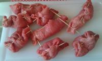 A questo punto prendiamo le fettine di vitello e dividiamole a metà se sono grandi. Disporvi al centro un po' di impasto e arrotolarlo e sigillare con gli stuzzicadenti, continuare con le restanti fettine e impasto fino ad esaurimento ingredienti, a me ne sono venuti 8 di involtini