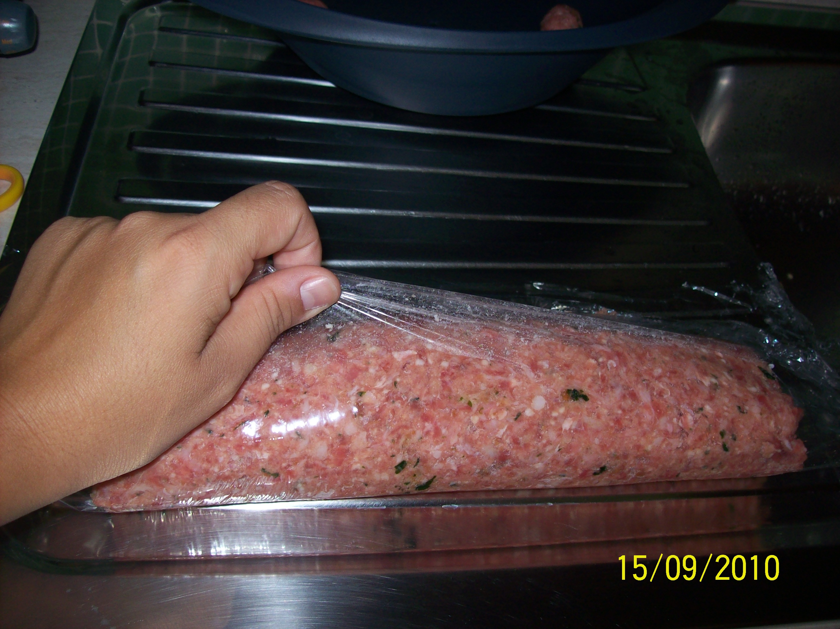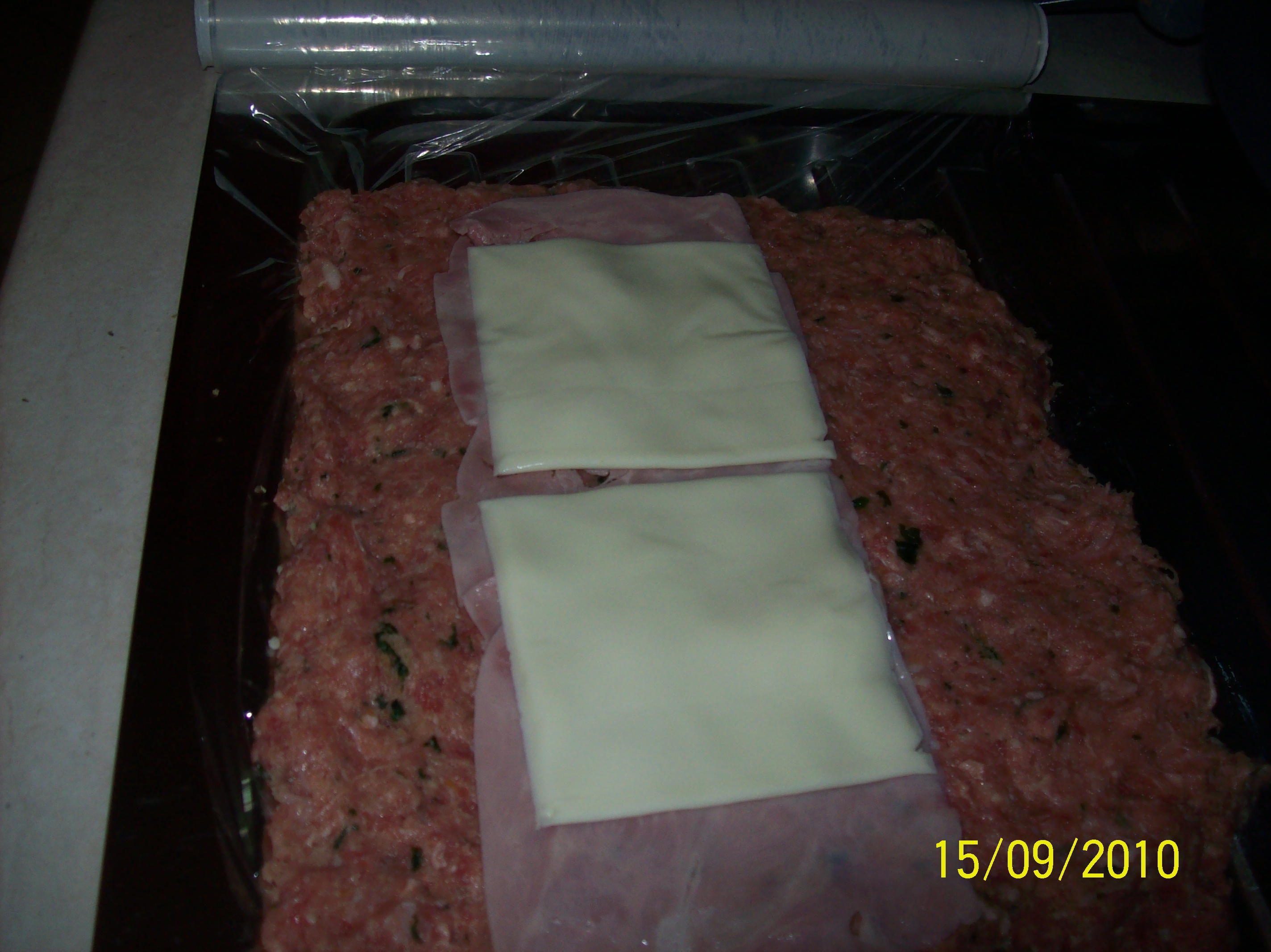 una volta formato il composto stirarlo su di una pellicola per alimenti e mettere prosciutto e sottilette arrotolare aiutandosi con la pellicola e formare il polpettone. Togliere la pellicola e adagiare nel varoma
