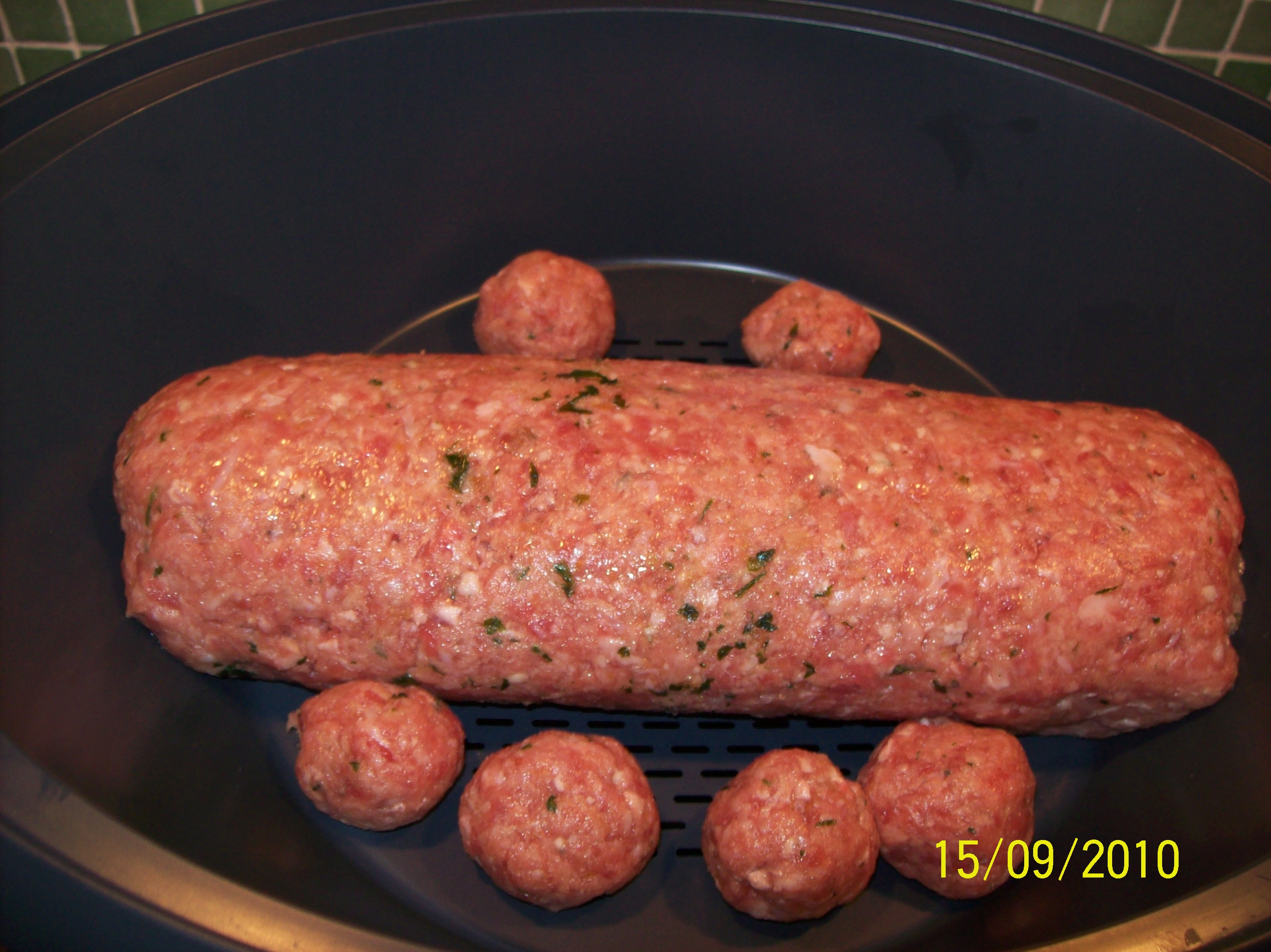 fatto oggi da portare al lavoro stasera. Polpettone con farcitura e polpette sena...(quasi) adatte alla dieta!cremina ottima e c'è già cotorno, meglio di così...
