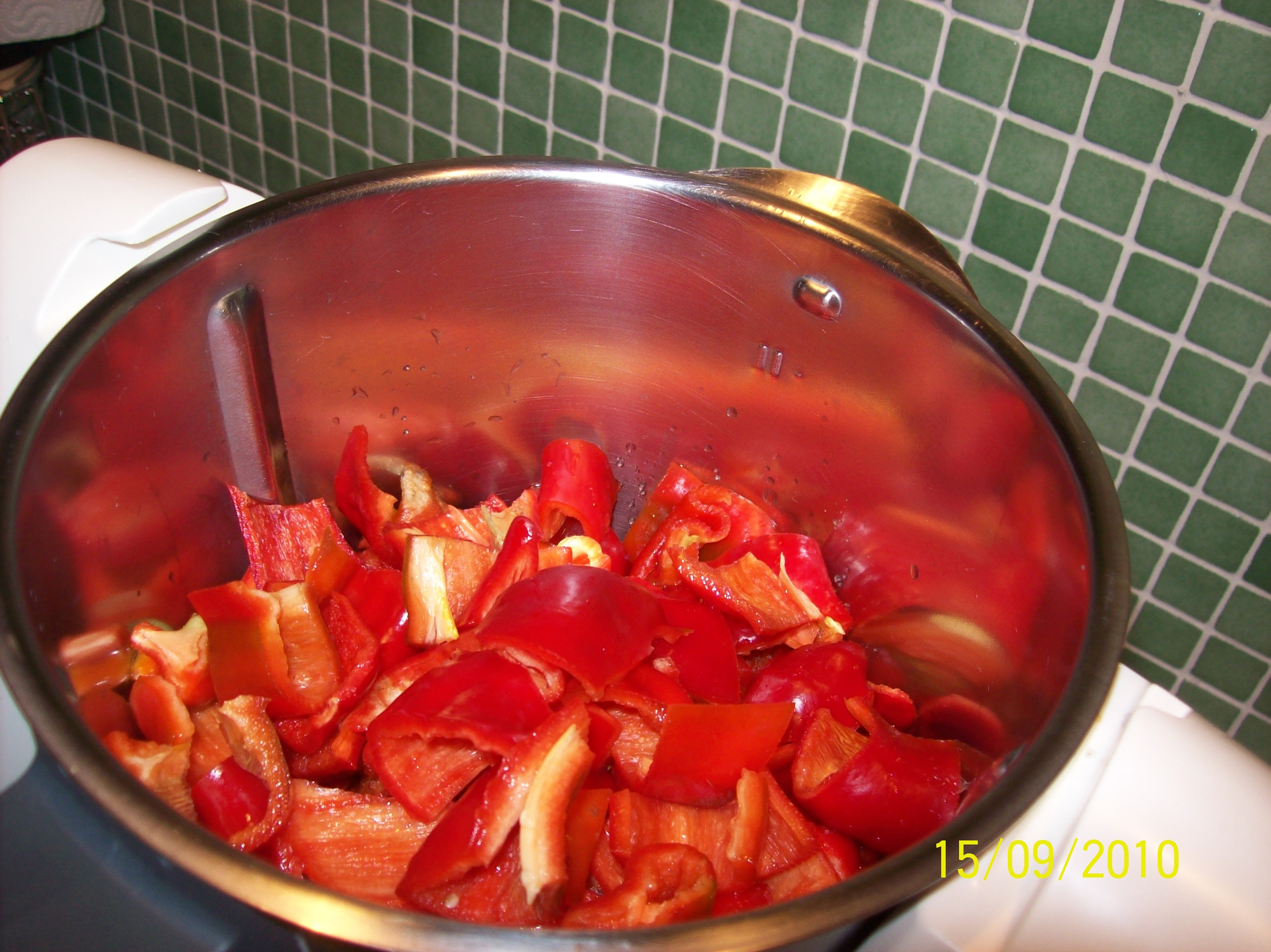 "velocità soft" aggiungere i peperoni sale vino e acqua e cuocere 20 min varoma