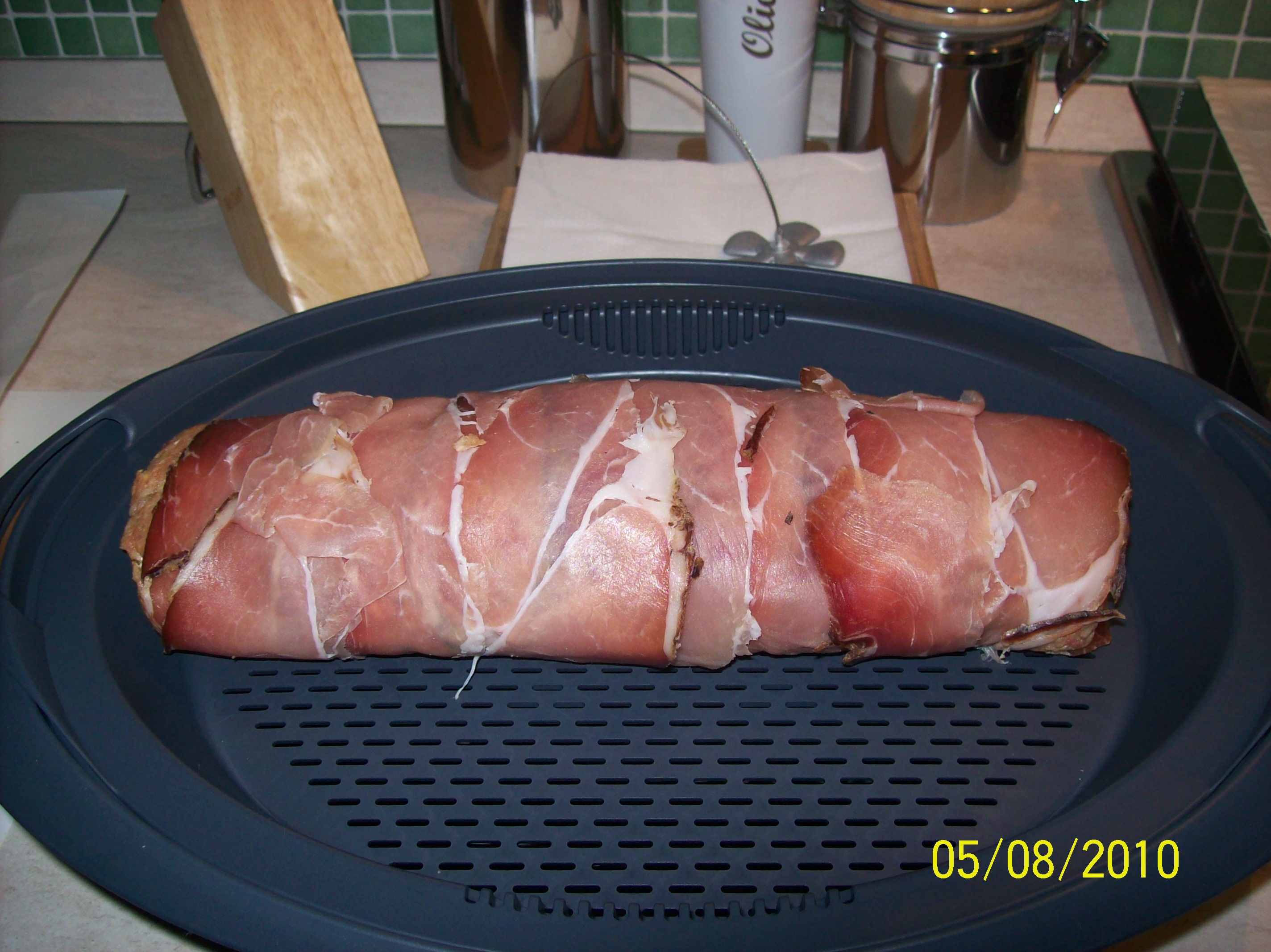 "antiorario" vel 4togliere il composto schiacciare bene con le mani formando un rettangolo e inserire prosciutto e galbanino dare la forma al polpettone e avvolgerlo con le fettine di speck