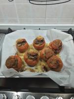 "coperchio chiuso" la carne macinata, la mortadella, l'uovo, il grana, il pane precedentemente ammollato nel latte, il prezzemolo, il sale ed il pepe., amalgamare: 10 sec. vel.5; - Aiutandovi con un cucchiaio, riempire i pomodori ad uno ad uno, socchiuderli con la propria calotta e metterli in una teglia;