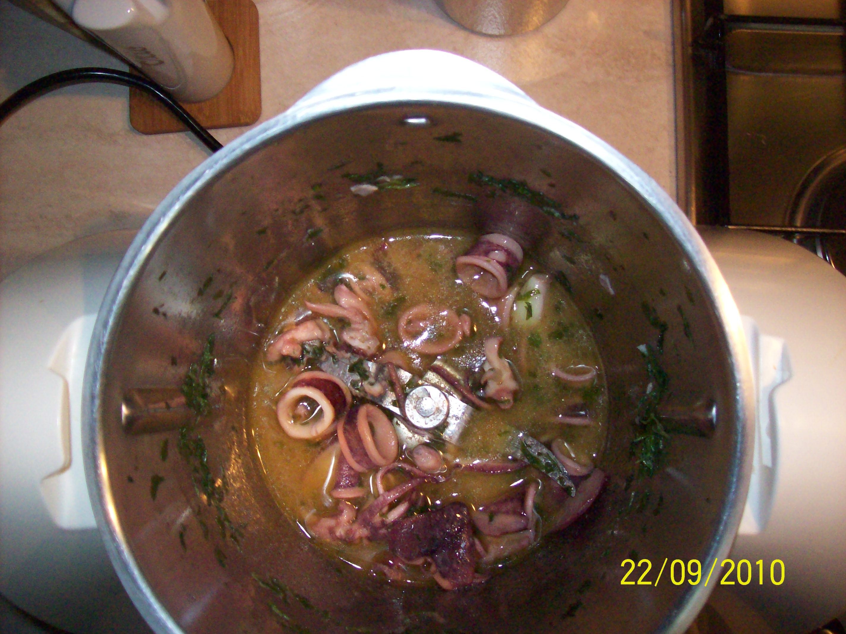 "coperchio chiuso" l'olio l'aglio e gli anelli di calamari e cuocere 10 min 100°vel 1dopo 5 minuti versare il vino