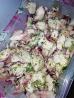Ho povato a fare l'insalata di polipo che ho mangiato 15 giorni fa ad un pranzo della comunione. Polipo, peperoni cotti tagliati a dadini (io ho tolto anche la pelle), farro bollito e zucchine crude tagliate a dadini, il tutto condito con olio, sale e limone. Buonissimo