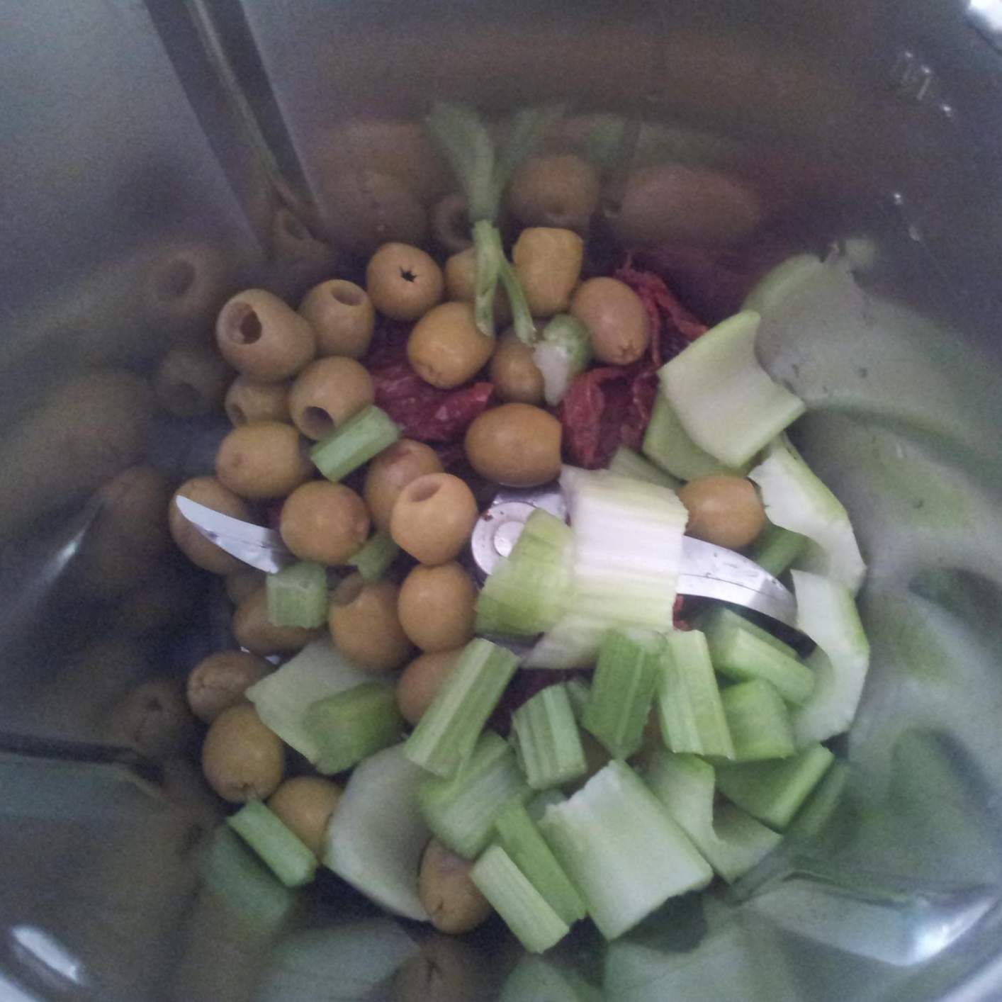 "coperchio chiuso" metà del sedano tagliato a pezzi, uno spicchio d'aglio, le olive verdi, i pomodorini secchi, metà dei capperi e tritare per 20 secondi a velocità 5, mettere da parte. 2. Farcire i filetti di platessa con il trito ottenuto formando degli involtini e posizionarli nel recipiente e nel vassoio del Varoma leggermente oliato. 3. Mettere nel