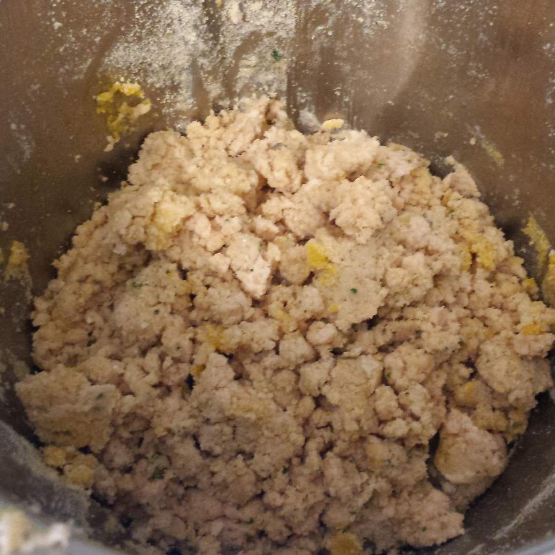 "coperchio chiuso" tritare il tutto vel. 7 per 7 secondi, il composto dovra risultare grossolano ma amalgamato; - Prendete della carta da forno, bagnatela e strizzatela e avvolgetevi il polpettone, prendete lo spago da cucina e legatelo;
