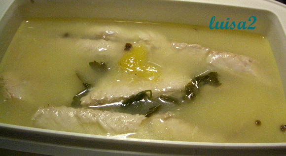 "coperchio chiuso" mettere lo scalogno e tritare: 5 sec vel 6, abbassare sul fondo, unire l'acqua, il succo e la scorza di limone, l'aglio in camicia, il pepe, il sale e l'olio, posizionare il Varoma e cuocere 10 min Varoma vel 2. Togliere i filetti, adagiarli in un contenitore basso e largo in modo da poterli contenere tutti in uno strato, vervarvi sopra la marinata ancora calda. far raffreddare prima di riporre in frigo almeno per 1 ora, meglio preparare questo piatto la sera primaservirli accompagnati da un'insalata mista