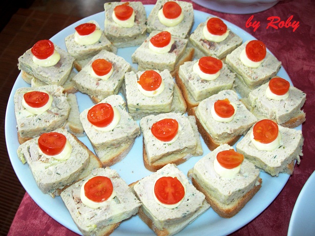 antipasto e tagliandola a quadrucci servita su crostini di pane, maionese e uno spicchio di pomodoro.