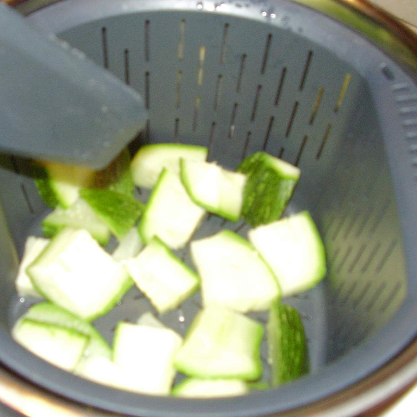 mettere le zucchine tagliate a tocchetti piccoli nel cestello, inserirlo nel boccale cuocere temp. varoma 10' vel 2