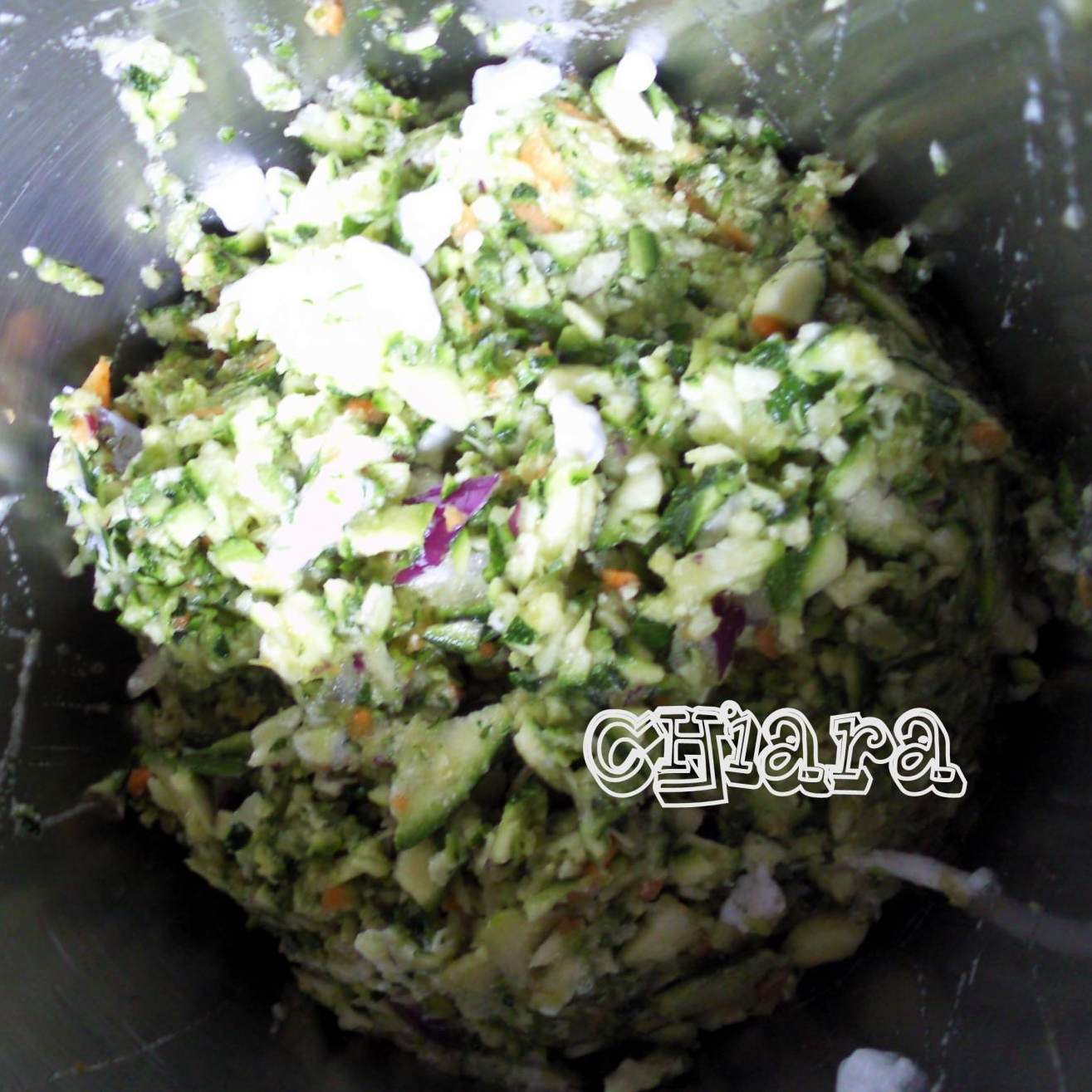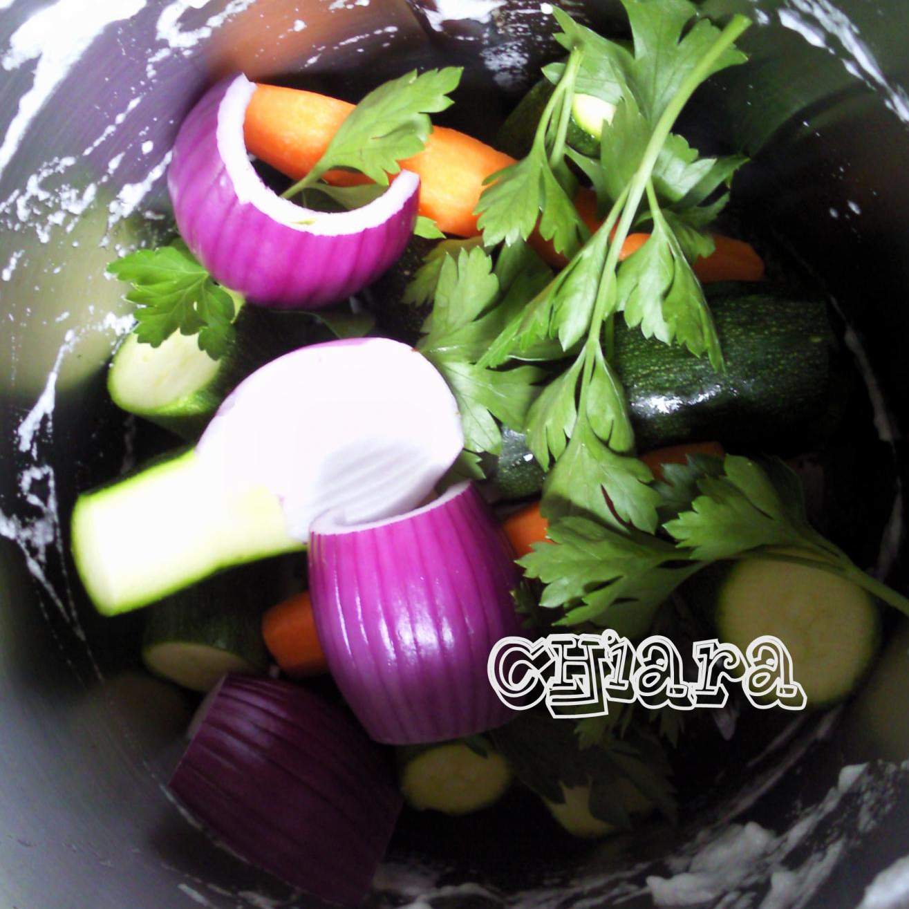 Senza lavare il boccale inserire zucchine, carote, cipolla e prezzemolo a pezzi e tritare 5'' vel 7.