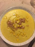 3. Mettere nel boccale le patate a pezzi, la cipolla a pezzi, il latte, il mais (tienine da parte 4 cucchiai) e l'alloro e cuocere: 20 min./90°/vel. 1 e mettere il cestello al posto di misurino durante la cottura.